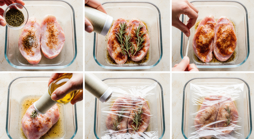 Add the chopped rosemary, salt, pepper, and drizzle with olive oil. Massage the chicken thoroughly to coat it with the seasonings, then cover with plastic wrap and set aside.