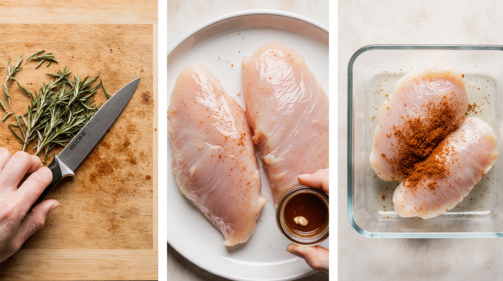 • Season chicken with paprika, rosemary, salt, pepper, and olive oil; massage and set aside.