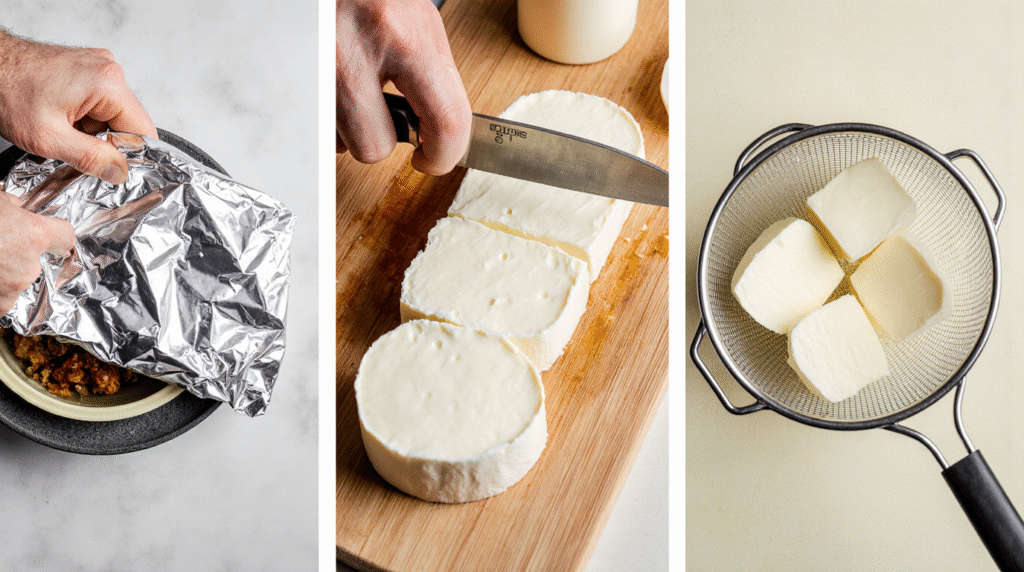 Cover the pan with aluminum foil and transfer it to a preheated oven at 392°F (200°C) for 25 minutes. Meanwhile, slice the mozzarella and let it drain in a colander to remove excess whey.