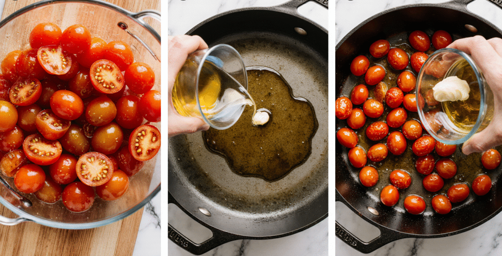 Now, wash and halve the cherry tomatoes. In an oven-safe pan, drizzle some olive oil and add the two garlic cloves. Let the garlic infuse the oil for a few minutes, then add the halved cherry tomatoes.