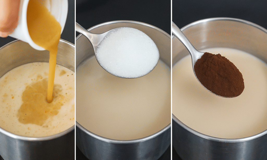 To prepare the Cappuccino Frappe (Energy-Boosting Frappe), start by brewing two cups of coffee using a moka pot. In a saucepan, gently heat the milk, then add the freshly brewed coffee, three heaping tablespoons of sugar, and two heaping teaspoons of unsweetened cocoa powder. Stir well until all the ingredients are fully dissolved and combined.