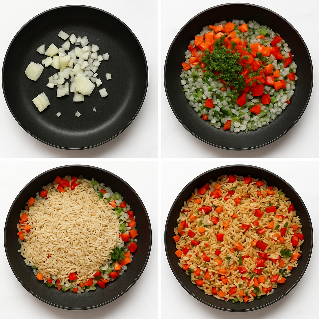 Heat 45 ml olive oil in a deep pan over medium heat. Add the finely chopped onion and sauté for 2-3 minutes until softened. Then add the finely chopped carrot, red bell pepper, chopped parsley, and orzo. Cook everything for 1 minute, stirring continuously.