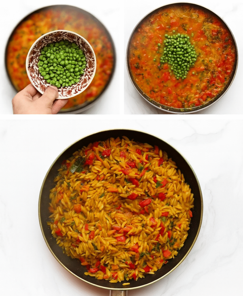 Add the peas, cover the pan again, and let everything simmer gently for another 10 minutes, or until the orzo is cooked through. Remove the pan from the heat and let the dish rest, covered, for 15 minutes.