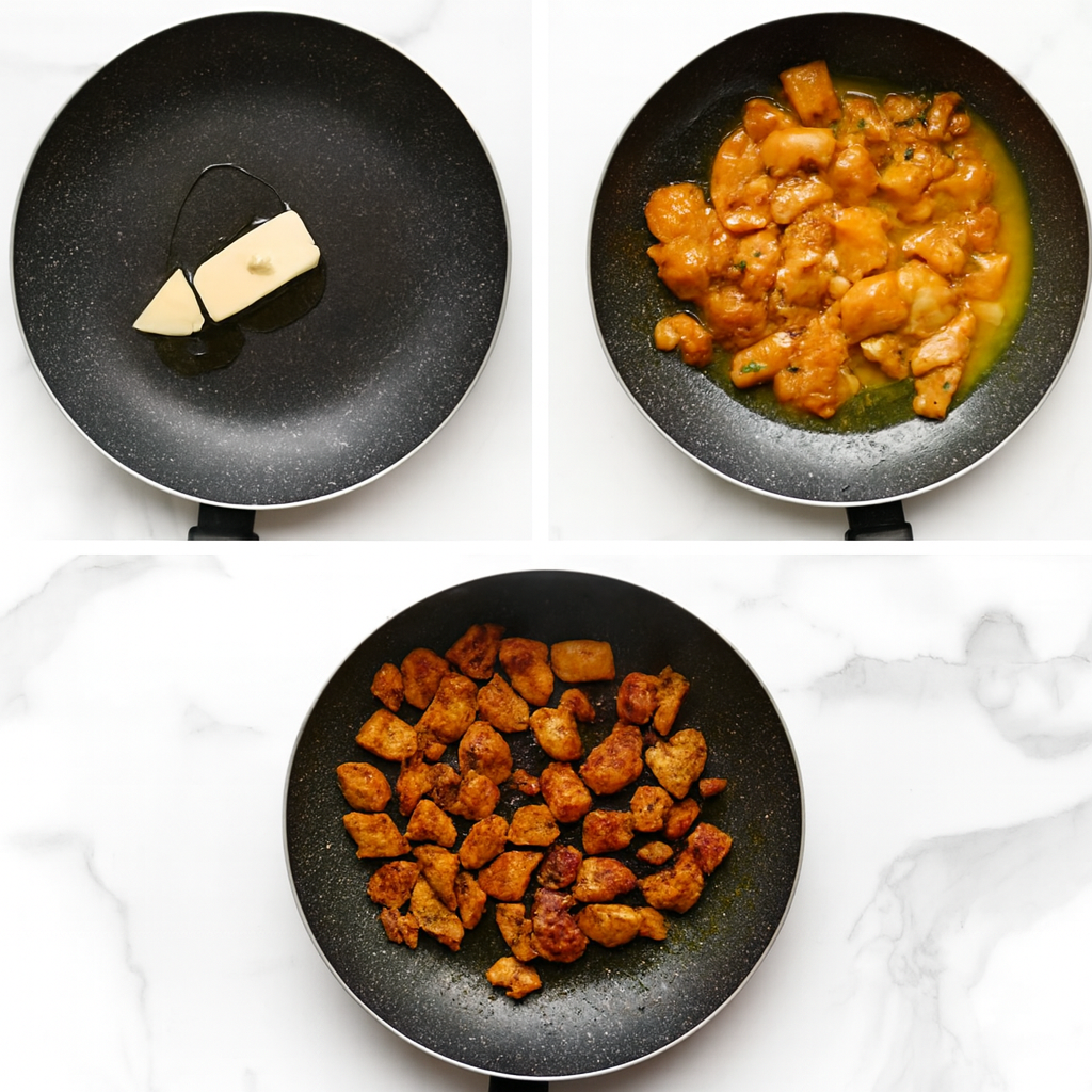 Heat 20 ml olive oil together with the butter in a frying pan over medium heat. Add the marinated chicken thighs and cook for a few minutes until golden brown and cooked through.