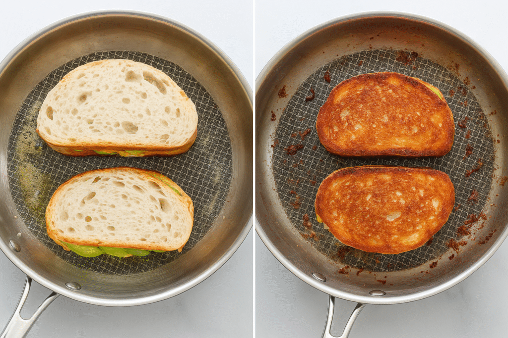 Use a spatula or grill press to gently press down on the sandwich in the pan — this helps the cheese melt faster and the bread get evenly crispy. - Let the Sandwich Rest Before Slicing