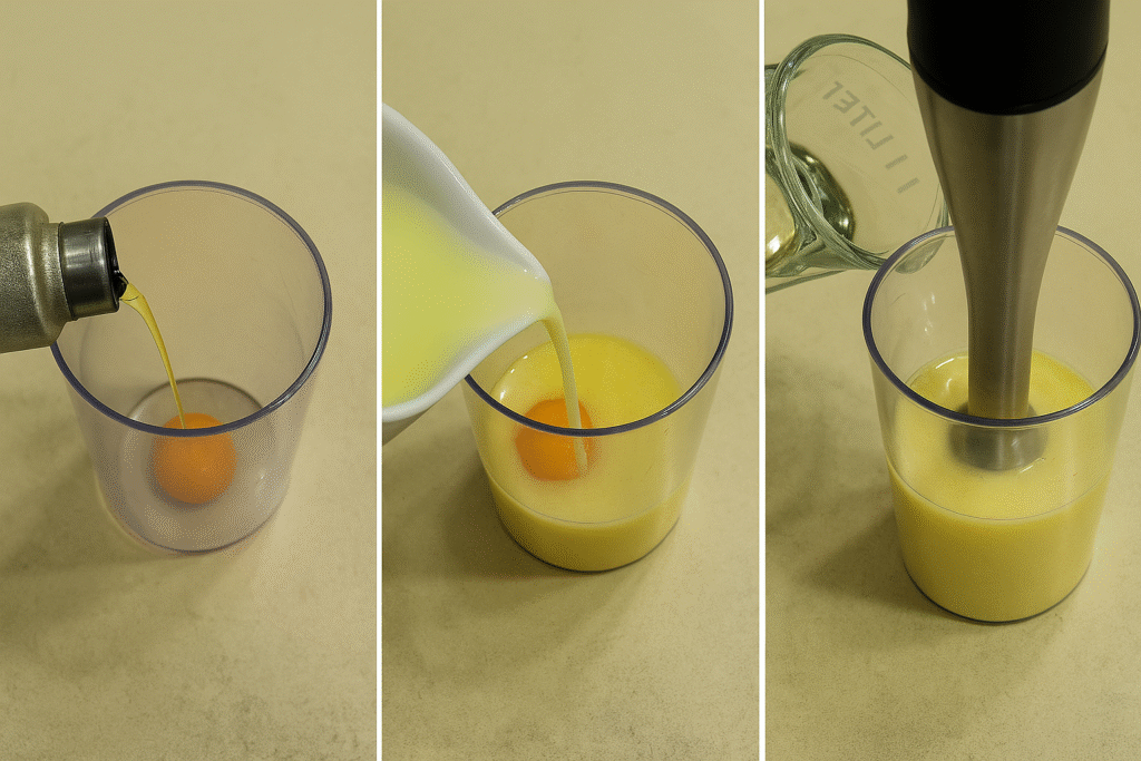 Whisk egg yolk and lemon juice in a tall glass. Slowly drizzle in oil while blending until creamy mayo forms.
