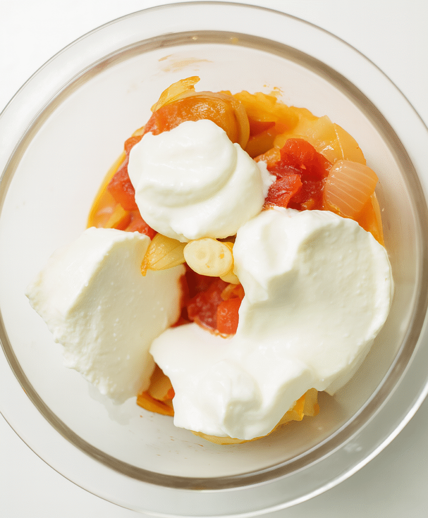 Add the cooked vegetables to a blender along with the crème fraîche. Blend until smooth and fully combined.