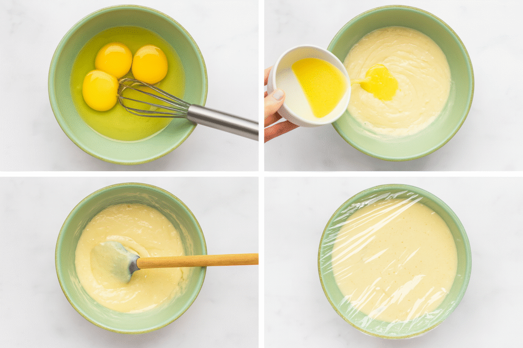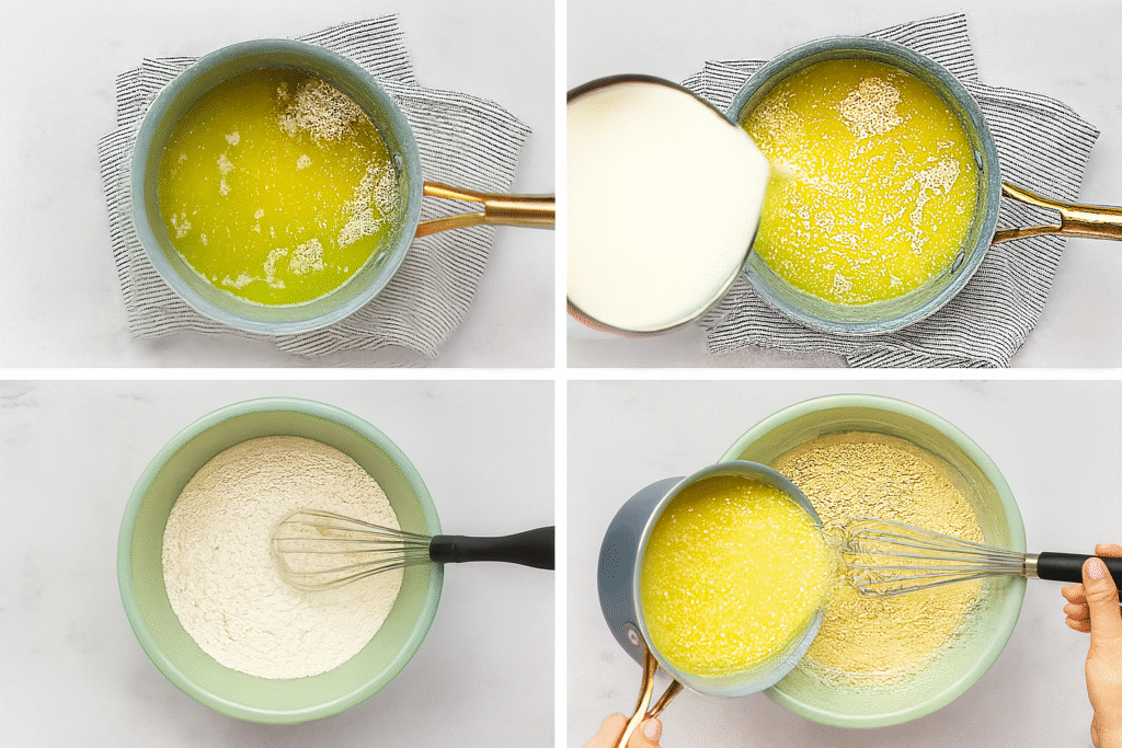 Melt the butter in a small saucepan over medium-low heat, then add the milk and warm it until it’s just warm to the touch, about a few minutes. Set the mixture aside. In a large bowl, whisk together the flour, sugar, salt, and yeast until combined. Gradually pour the warm milk and butter mixture into the flour mixture, whisking continuously until the batter is smooth and well blended.