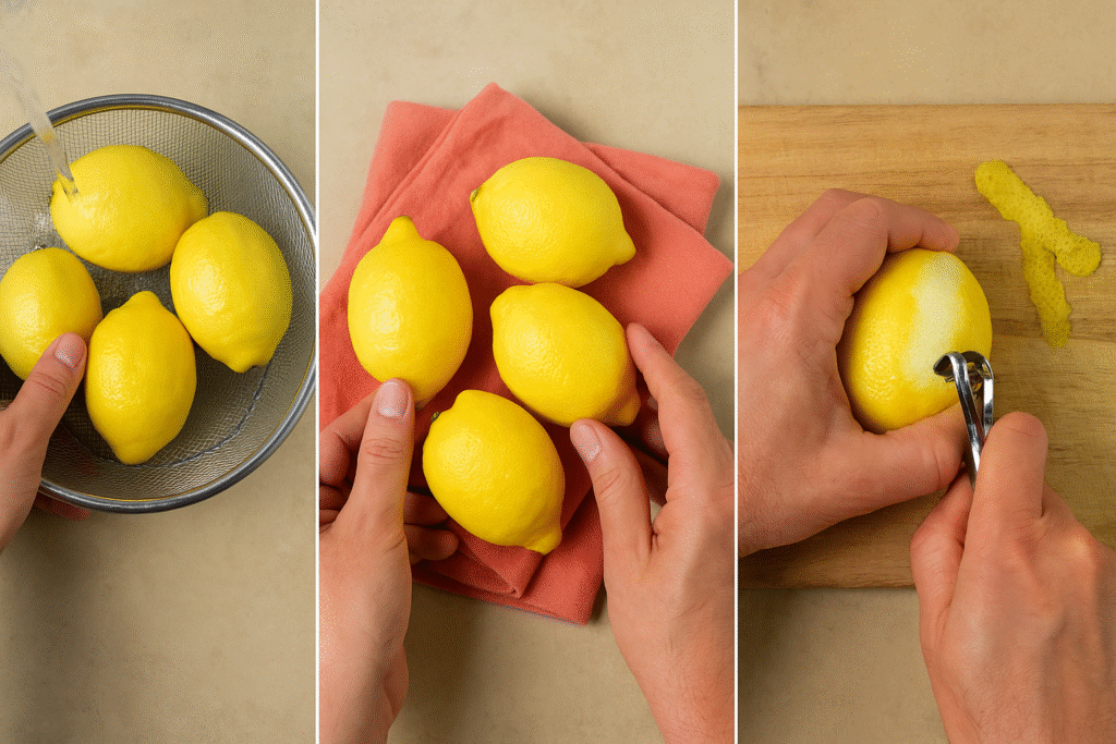 To make limoncello, start by washing the lemons thoroughly under running water. Gently scrub the peel with a clean sponge to remove any dirt, then dry the lemons with a cloth. Using a potato peeler, carefully remove just the yellow zest, avoiding the bitter white pith underneath.