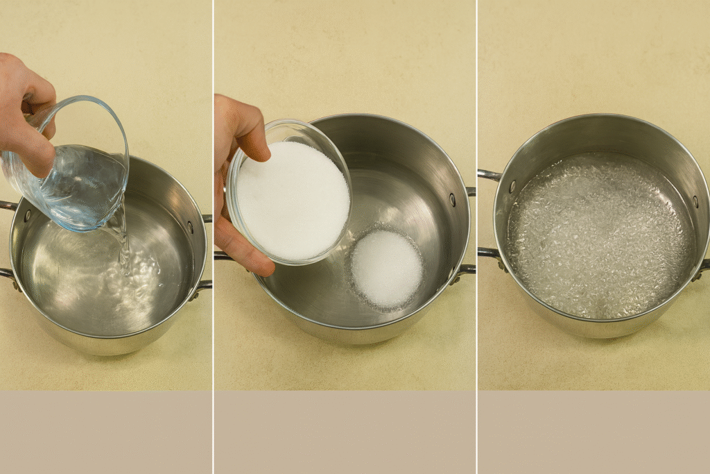 In a pot, dissolve sugar in water over low heat; cool completely.