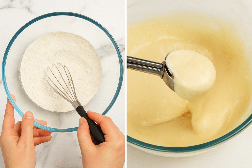 In a mixing bowl, whisk together the dry ingredients — flour, baking powder, and a pinch of salt. Make a well in the center, then add the egg, milk, and vanilla extract. Whisk everything together until the batter is smooth and nearly lump-free. It should be thick yet pourable, similar to the consistency of thick honey. If the batter feels too thick, add a splash of milk; if it’s too runny, mix in a little extra flour.