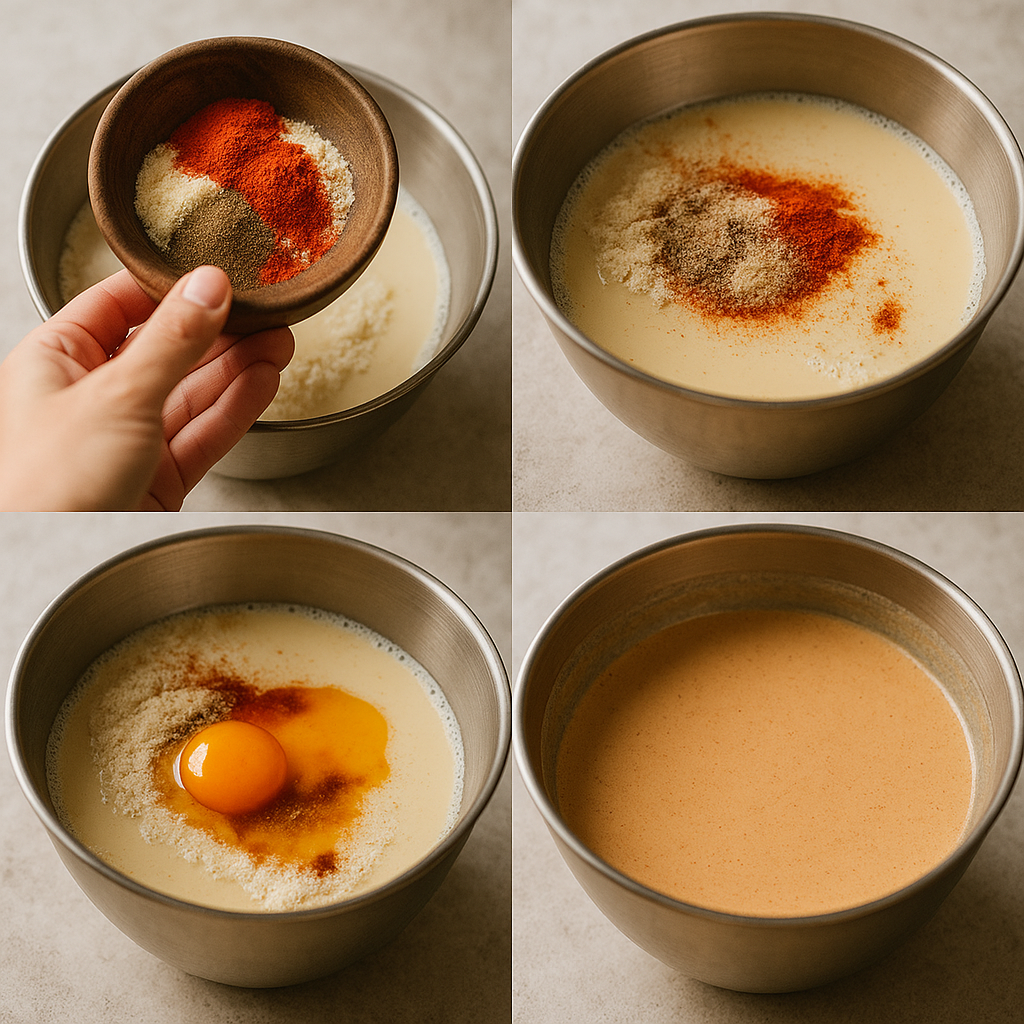 In a large bowl, combine the buttermilk, salt, chicken seasoning, garlic powder, onion powder, black pepper, cayenne pepper, and the egg. Mix well until smooth and fully combined.