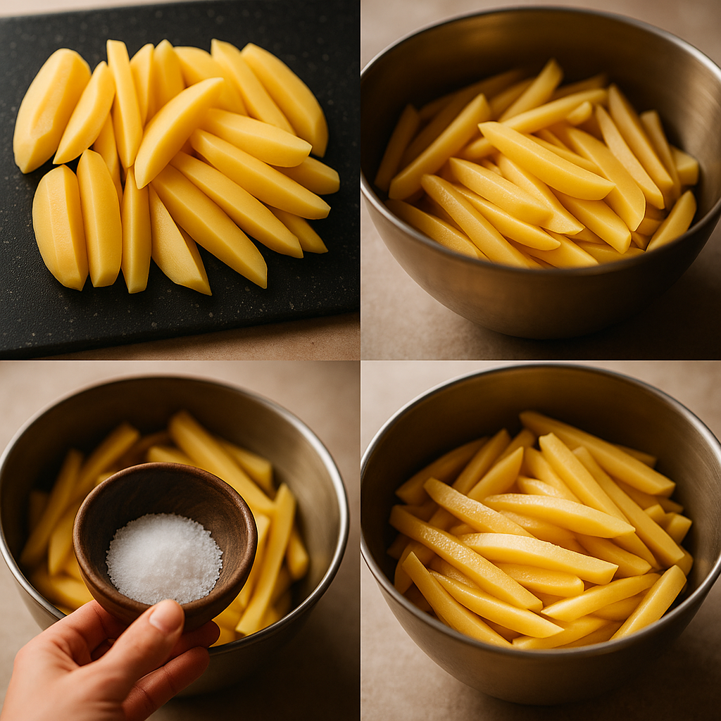 Peel the potatoes. Slice them lengthwise into slabs, then cut into thin sticks to make fries. Place the fries in a large bowl, add the salt, and mix well to coat evenly.