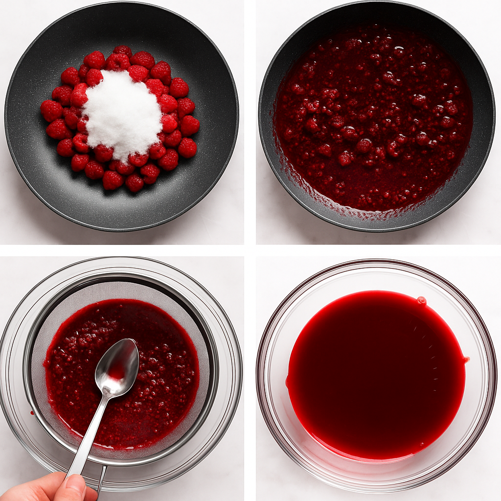 Make the Jam: In a pan over medium heat, cook raspberries, sugar, and water until bubbling. Simmer for 5–7 minutes, stirring occasionally. Strain to remove seeds and pour into a piping bag.