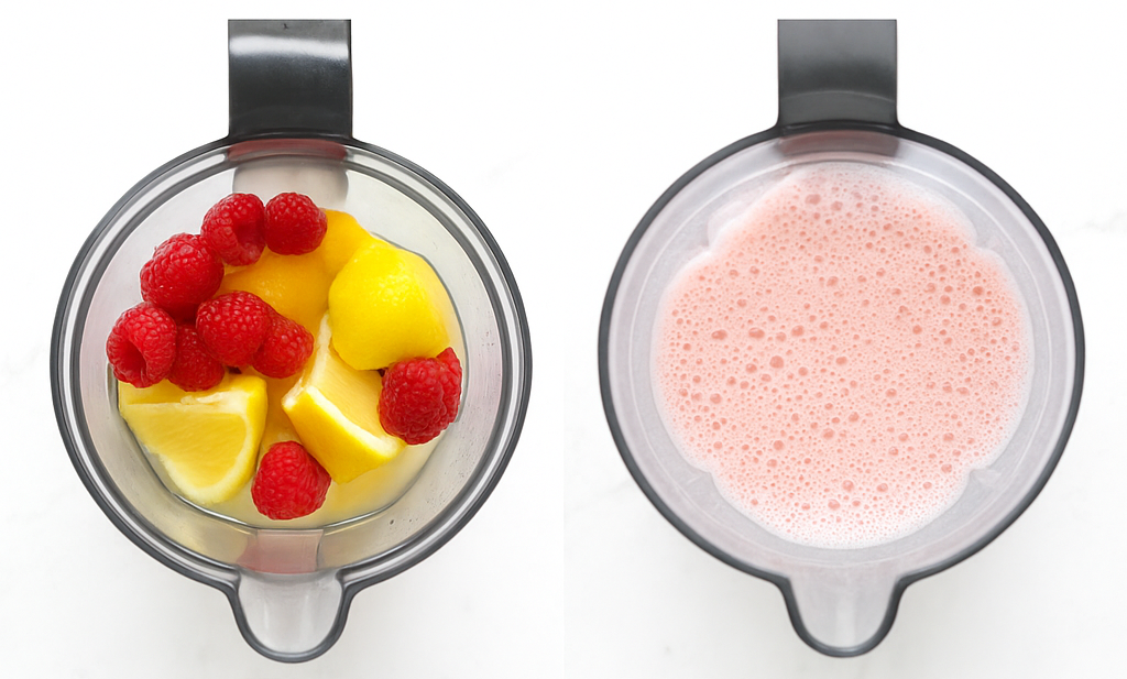 Blend the Fruits: Wash the lemon and raspberries. Cut lemon into chunks and blend with raspberries and water for 2 minutes.