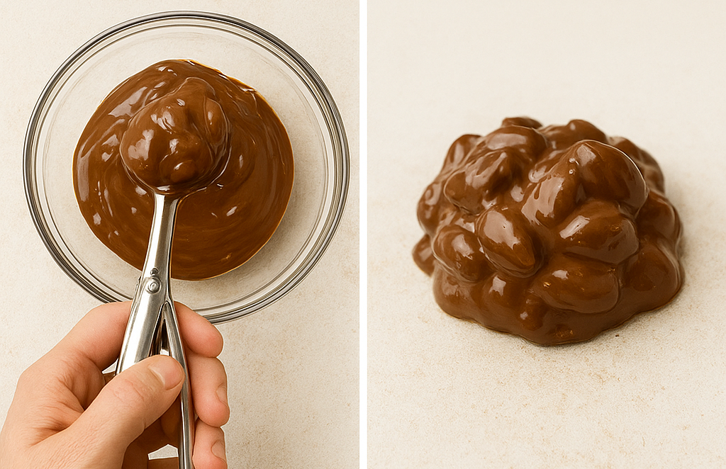 • Work Quickly: Once the almonds are mixed into the chocolate, scoop the clusters right away before the chocolate begins to set.