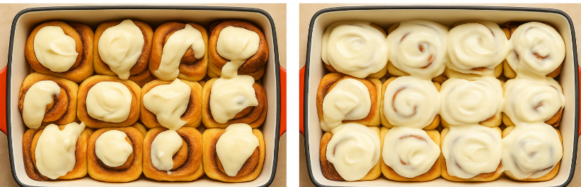 - Let the cinnamon rolls cool slightly before spreading the topping. This helps keep the topping firm and spreadable.
