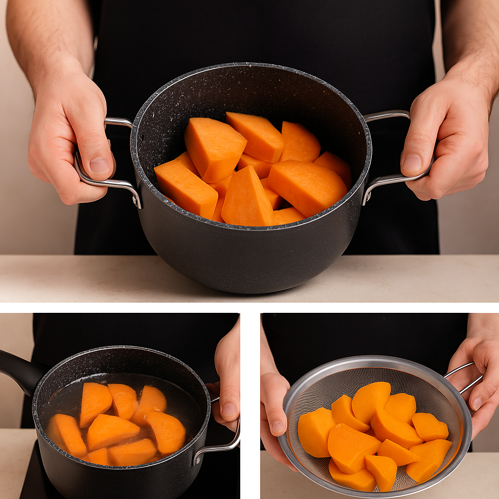 Peel and cut the sweet potato into chunks. Place the pieces in a saucepan with water and bring to a boil. Cook for 10–15 minutes, or until the sweet potato is fork-tender. Drain the water and set aside.