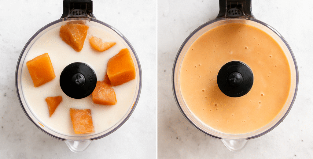 Add the cooked sweet potato and milk to a food processor. Blend until smooth.