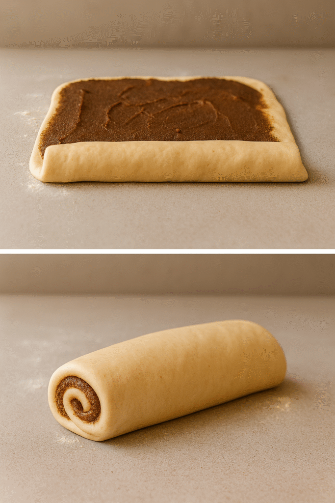 Spread the cinnamon mixture evenly over the surface of the dough. Then roll the dough tightly, starting from the long side.