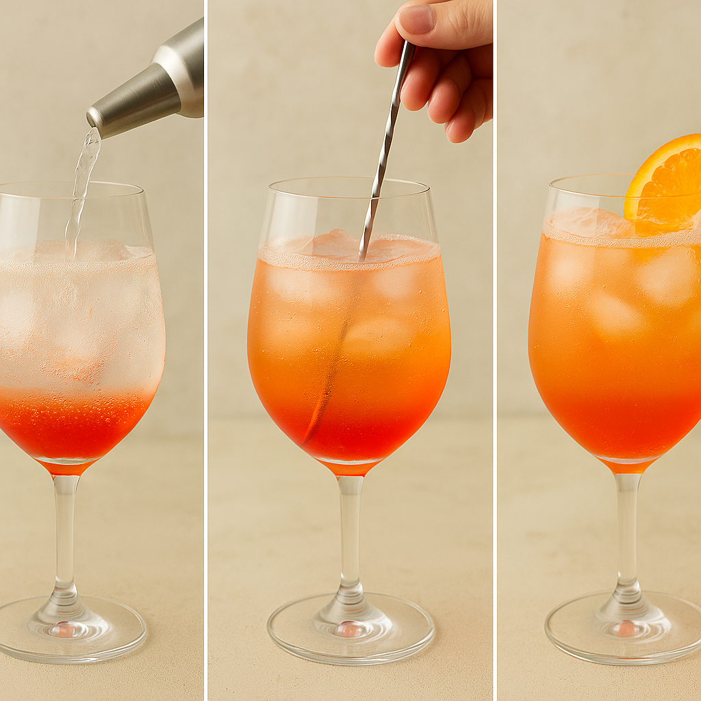 Finally, add a splash of soda water or very sparkling water. Top up with a bit more ice, stir gently, and garnish with half a slice of orange—your Spritz is ready to enjoy!