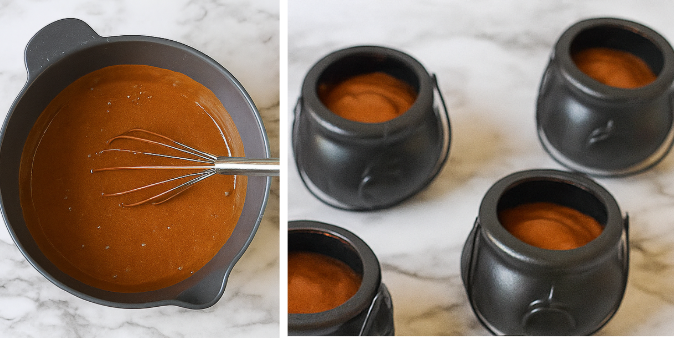 In a large mixing bowl, whisk together the chocolate pudding mix and milk until smooth and fully combined. Then, evenly divide the pudding into the washed and dried mini cauldrons.