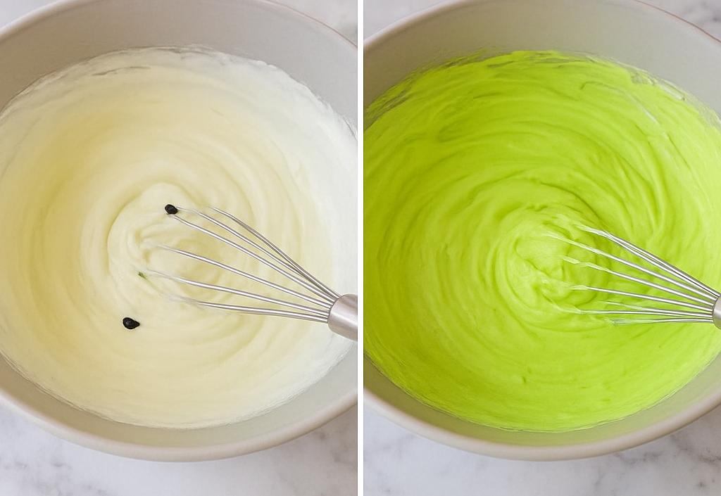 Add Cool Whip to a mixing bowl and stir in a few drops of green gel food coloring. Whisk gently until the color is evenly blended, adding more food coloring as needed to achieve your desired shade of green.
