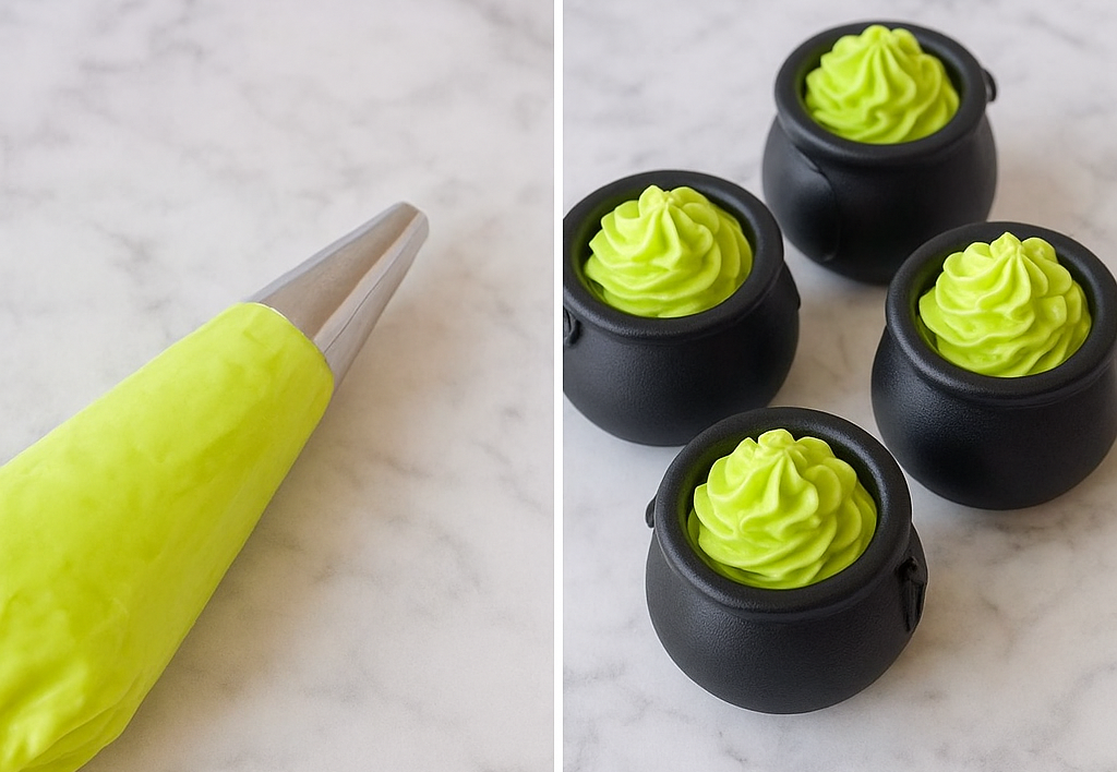 Transfer the green-colored whipped cream to a piping bag fitted with a star tip. Pipe the Cool Whip on top of each pudding-filled cauldron to create a fun, fluffy “potion” effect.